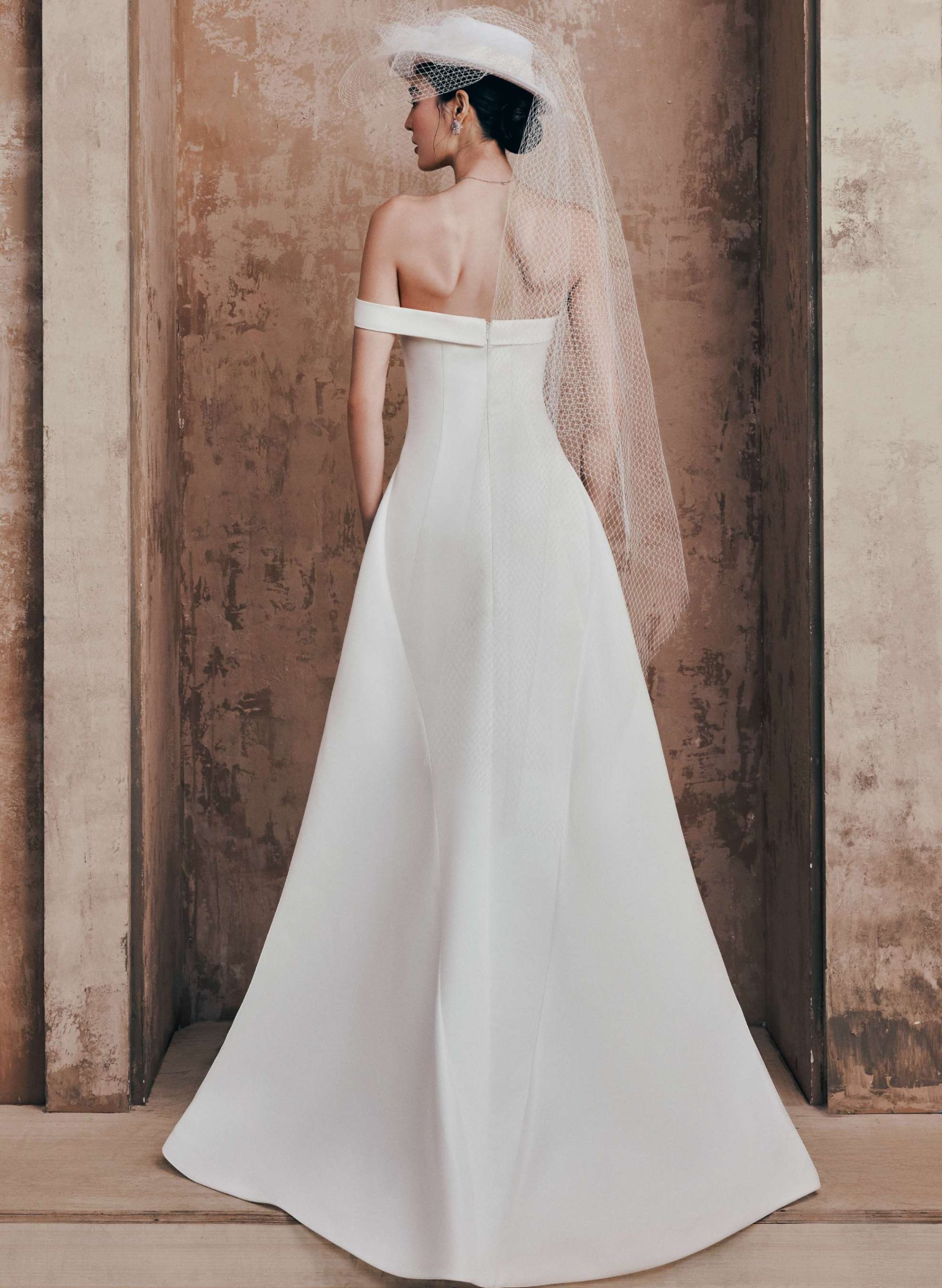 A study in pure elegance, this classic volume gown is defined by its structure and refined detailing. Crafted from premium Satin Silk, the bodice features expert panelling and a signature asymmetrical bow. The full Volume skirt ensures a regal silhouette, flawlessly concealing and complementing the figure.